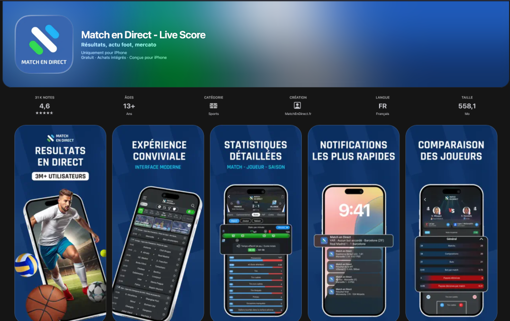 Match En Direct est une application mobile spécialisée dans le suivi en direct des compétitions sportives. Elle combine live scoring, données statistiques avancées et fonctionnalités communautaires au sein d’un même environnement.
